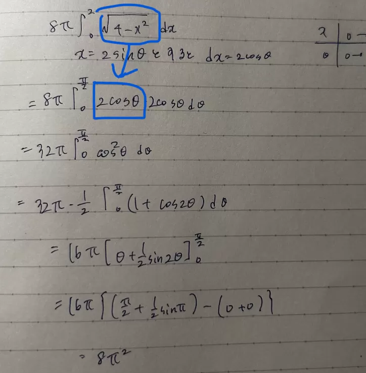 x=2sinθと置いて積分したのですがどうしても8π^2になってしまいます。