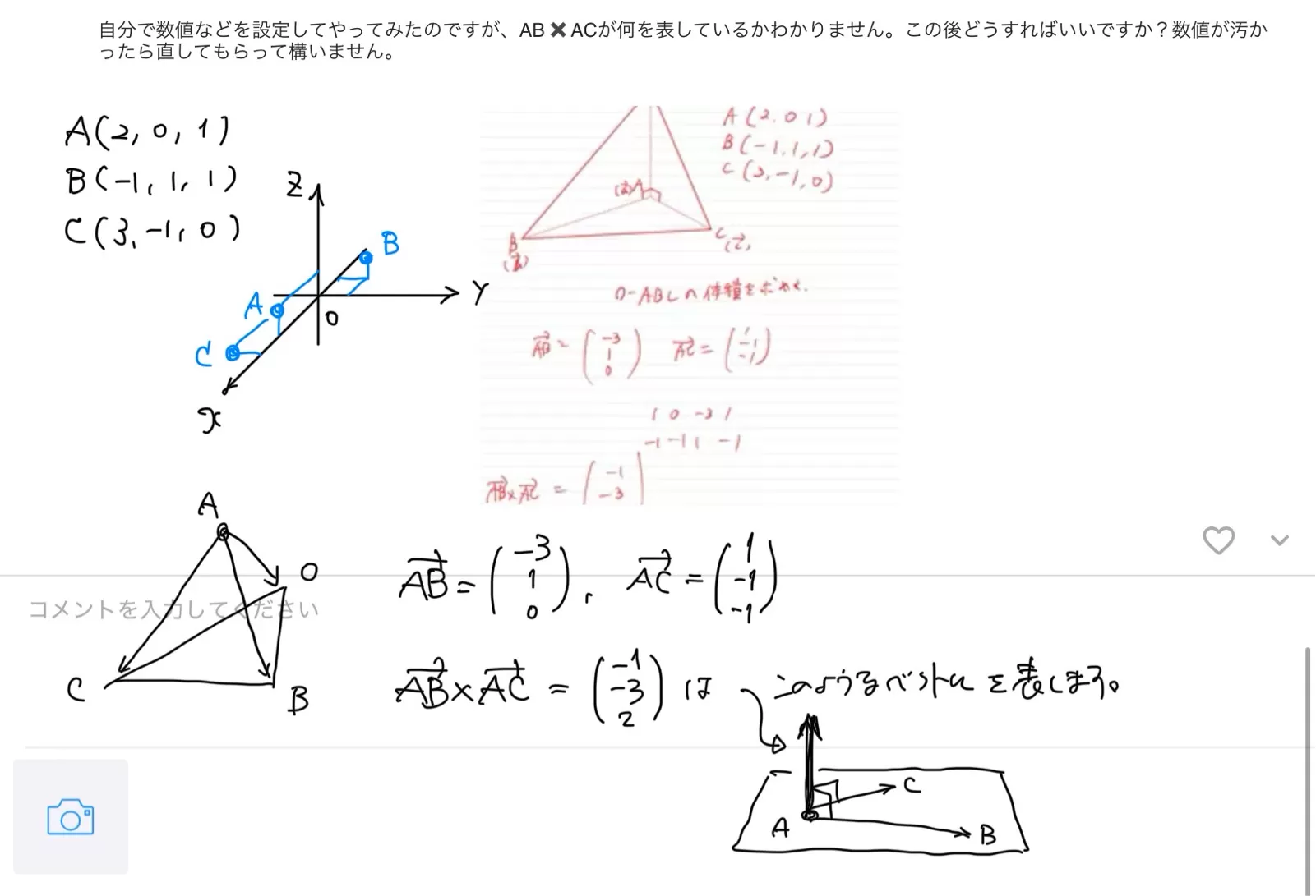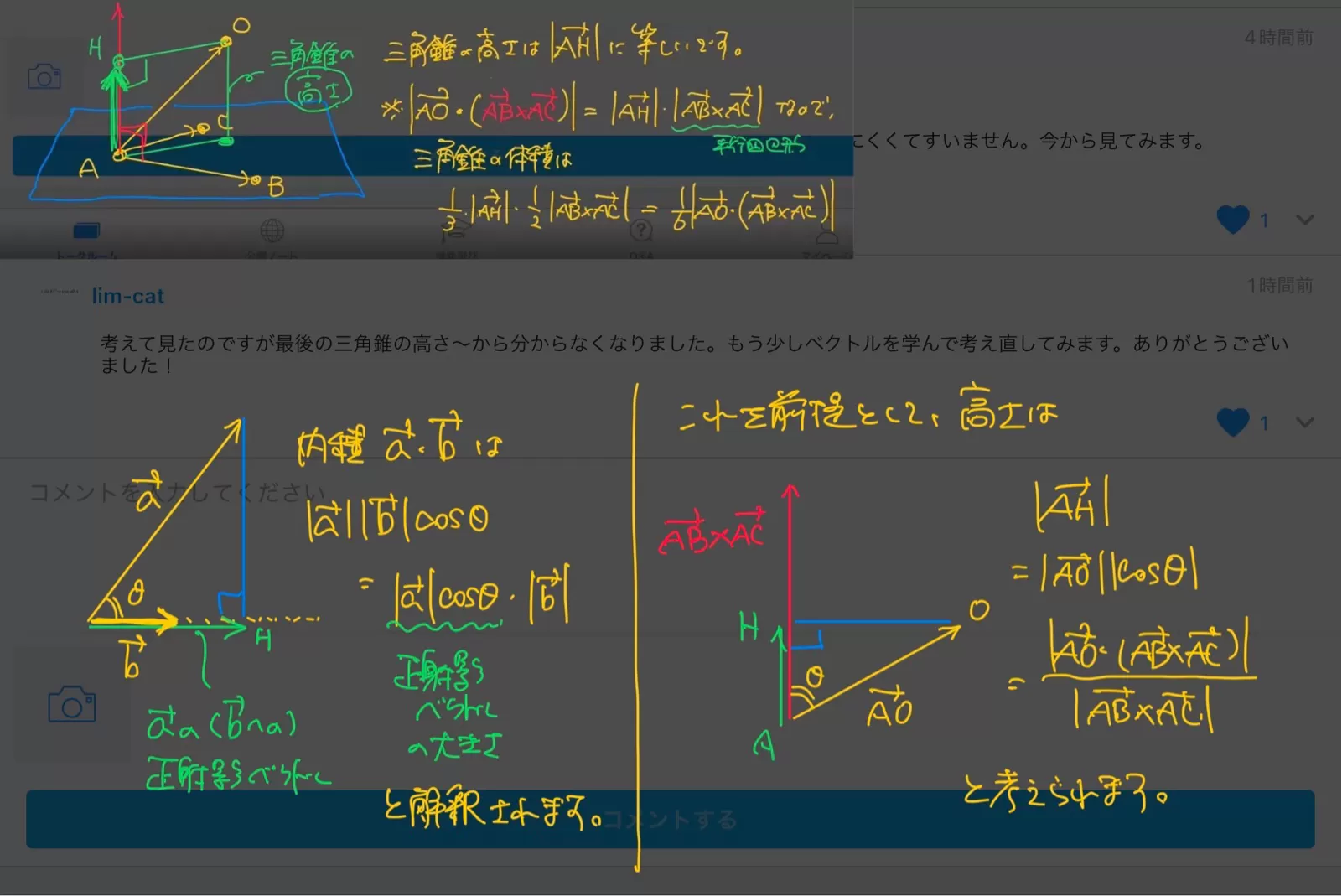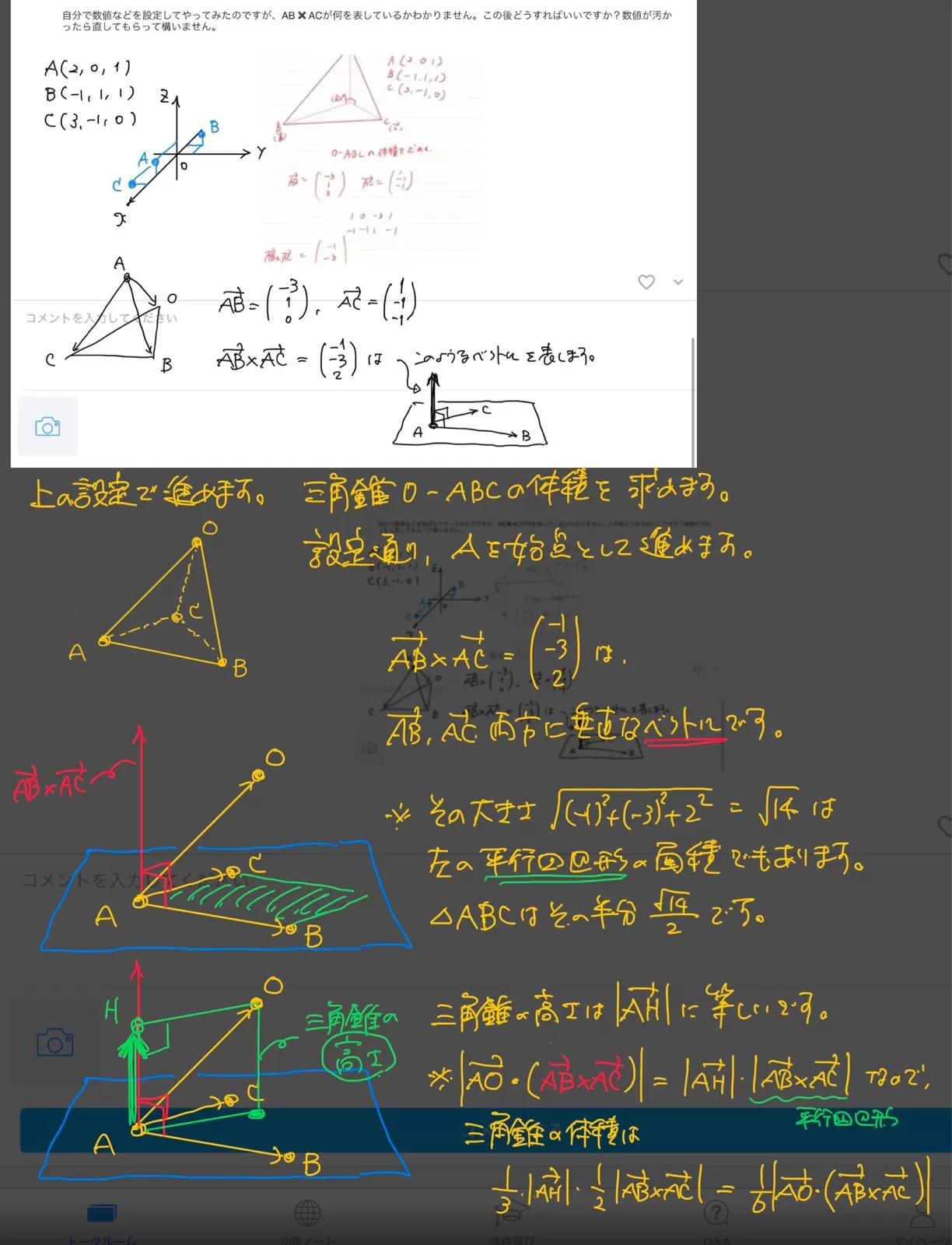 考えて見たのですが最後の三角錐の高さ~から分からなくなりました。もう少しベクトルを学んで考え直してみます。ありがとうございました!
