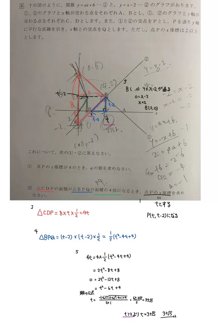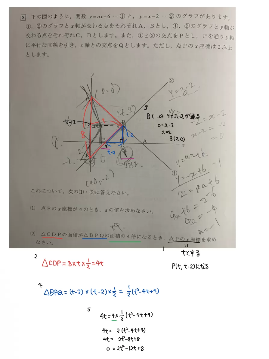 今回は面積が4倍になる時、点PのX座標を求める問題でしたが、面積を2等分する直線、平行四辺形などの図形を作る時の点Pの座標、面積が等しくなる時の点Pの座標、A=𓏸𓏸の時、図形の面積を求める問題など、数が多くて求め方をまとめきれません💦