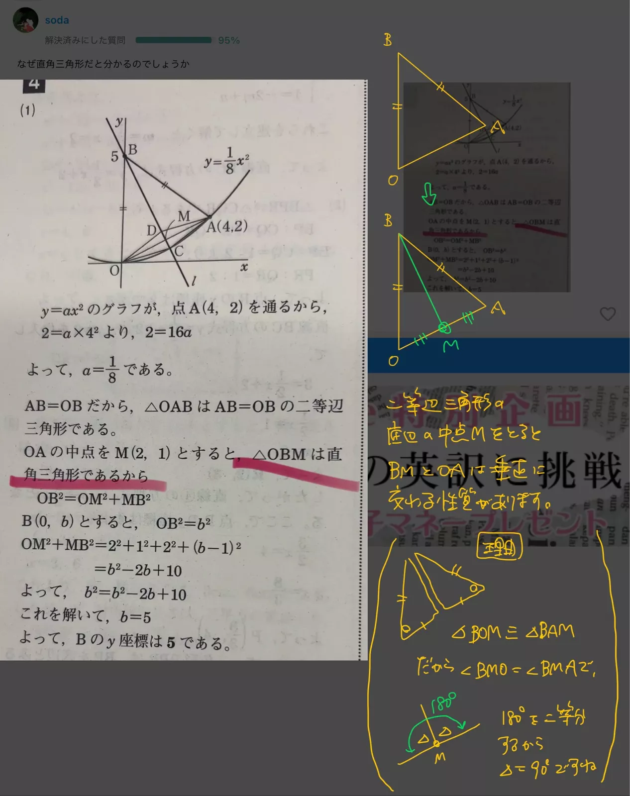 この性質から、「頂点と底辺の中点を結んだ線は底辺と垂直になる」ということです。したがって∠BMOが90°となるので、△OBMは直角三角形になります。