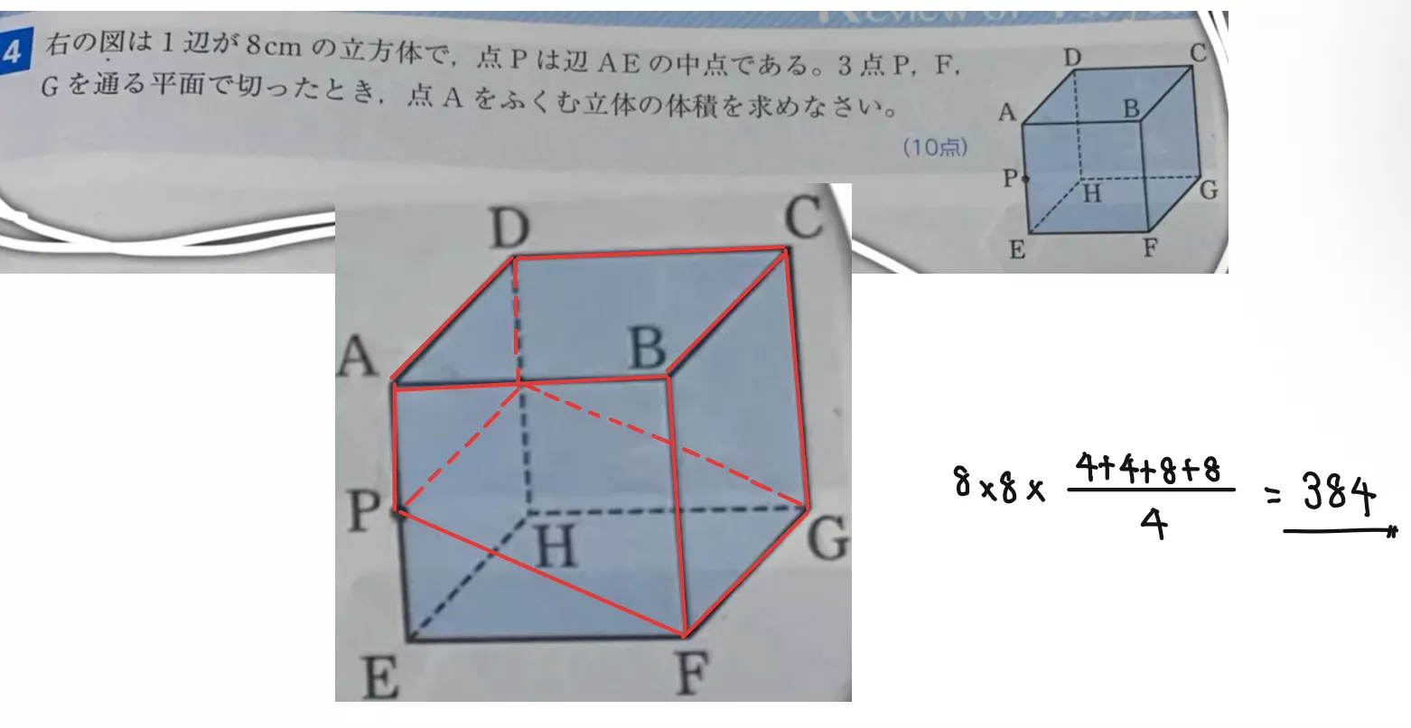 Gを通る平面で切ったとき,点Aをふくむ立体の体積を求めなさい。