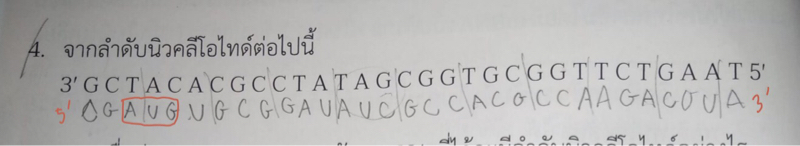ข้อ2 โจทย์ถามถึงกระบวนการแปลหรัสเริ่มที่ met(เมไทโอนีน) แต่ลองแปลแล้วมันไม่ตัวไหนที่เป็นเมไทโอนีนเลยค่ะ งงอ่ะค่ะไปข้อต่อไปไม่ได้เลย ... ช่วยอธิบายหน่อยนะคะ🙏🙏