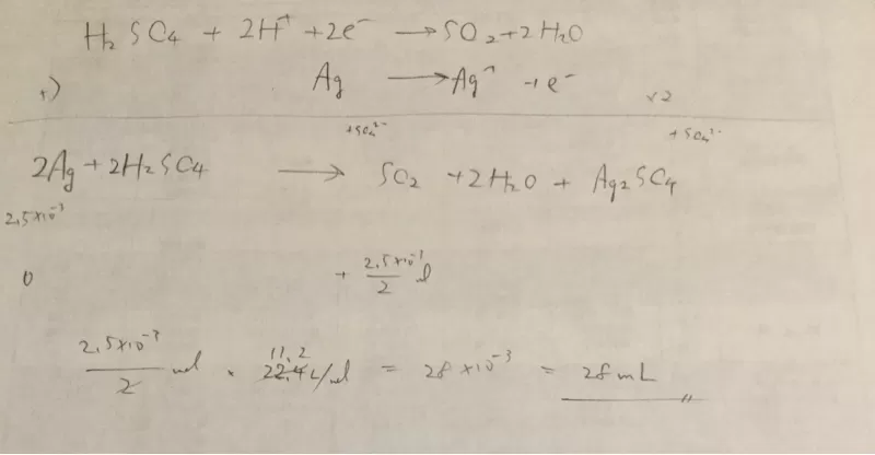 で③ア銀単体 2.5X10? mol を全て替濃確酸と反応させた。このとき発生ぶる三友Ac司