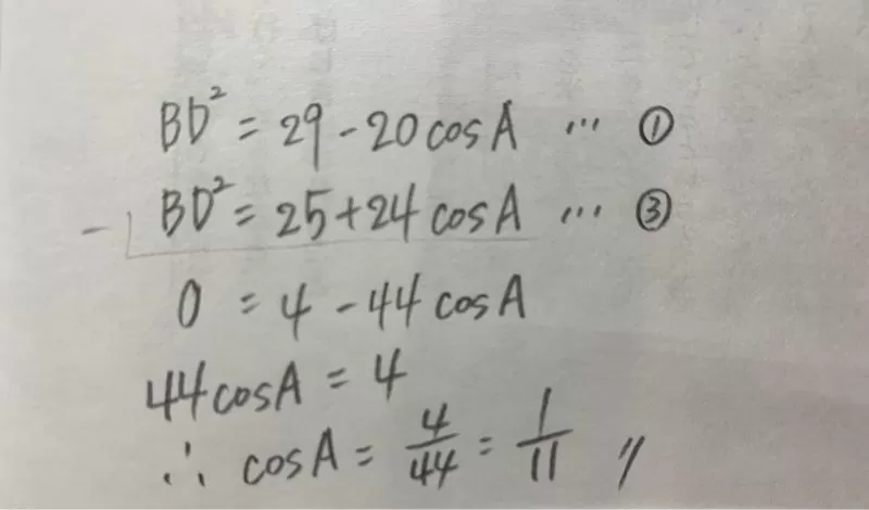 cosAを求める問題です。