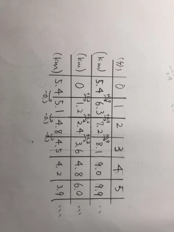 普通はその表の2分目の時は5.4+0.9×2=7.2km、そのあとも0.9ずつ増えます。