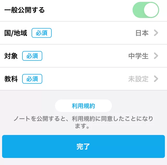 ノートを作る画面の公開設定というところで、公開にして教科だったりを選択するとノートを公開できます。