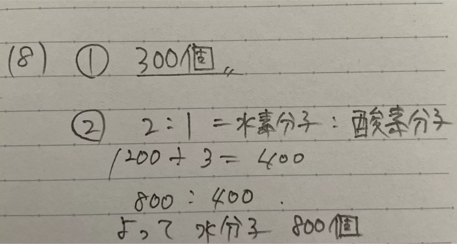 2 電気分解後の水素分子と酸素分子の合計は 1200個であった。分解した水分子は