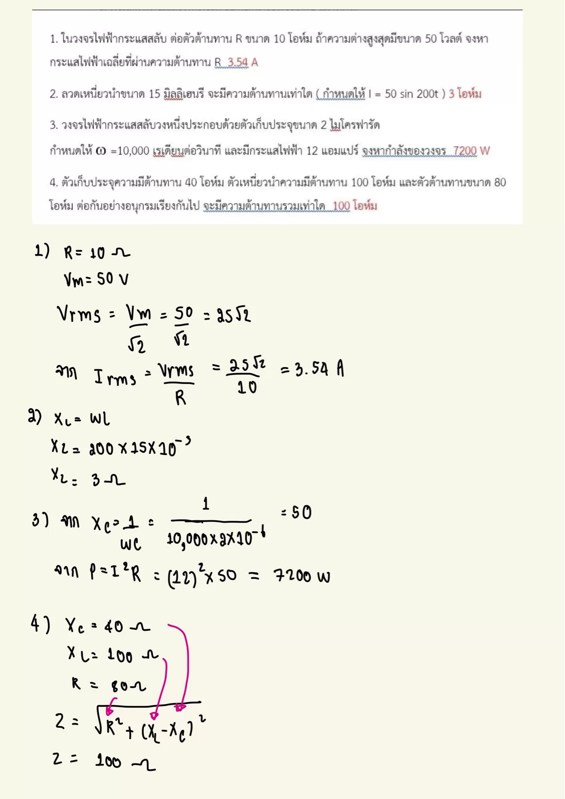 1. ในวงจรไฟฟ้ากระแสสลับ ต่อตัวต้านทาน R ขนาด 10 โอห์ม ถ้าความต่างสูงสุดมีขนาด 50 โวลต์ จงหา