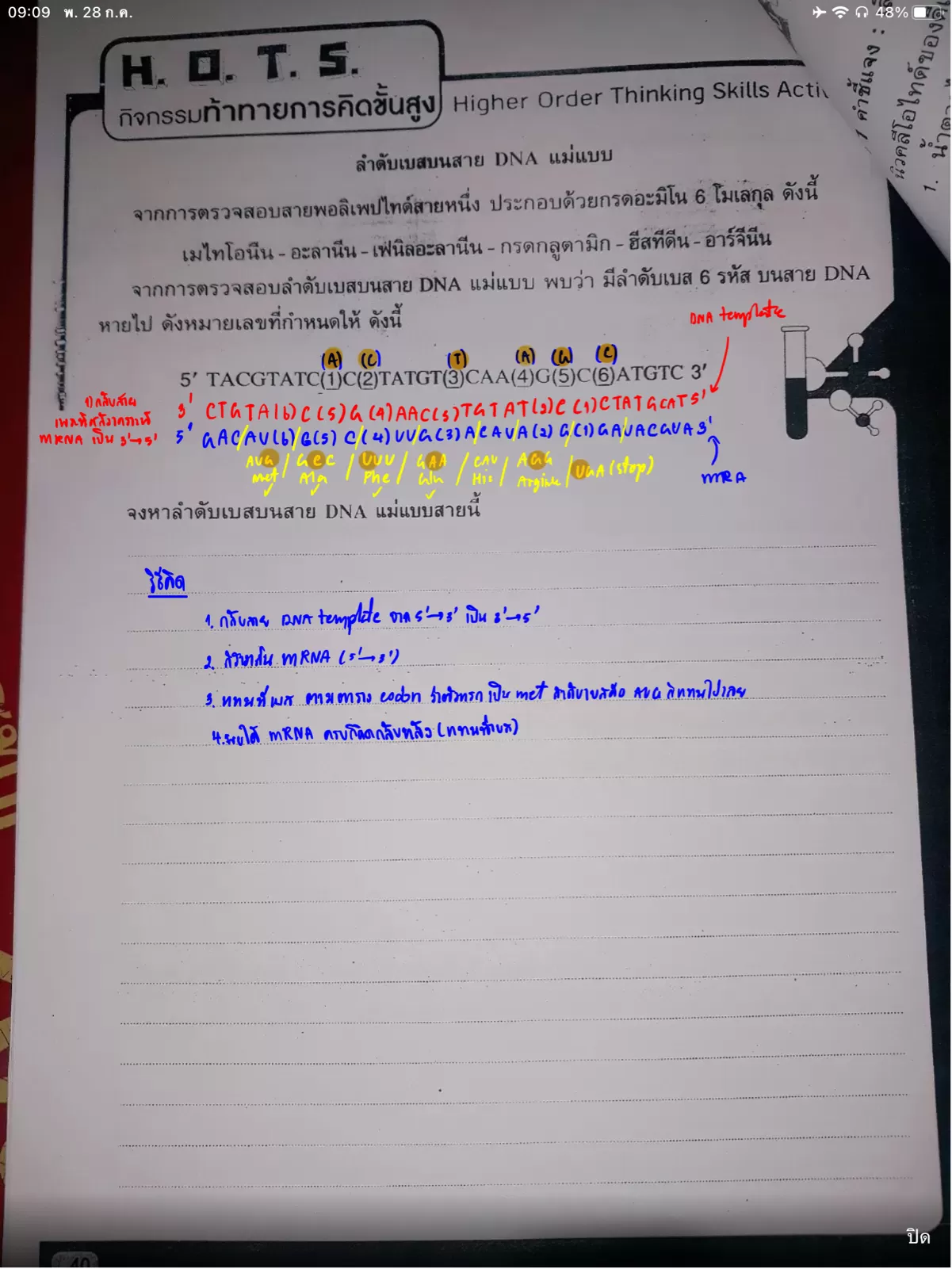 จงหาลำดับเบสบนสาย DNA แม่แบบสายนี้