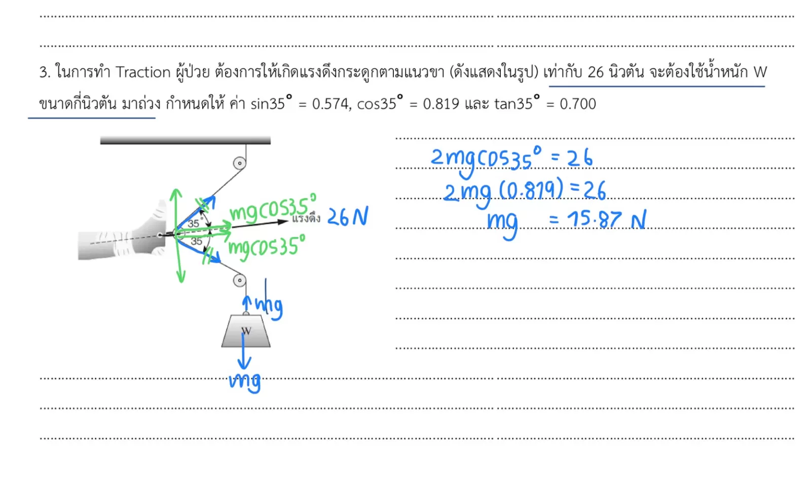 3. ในการทำ Traction ผู้ป่วย ต้องการให้เกิดแรงดึงกระดูกตามแนวขา (ดังแสดงในรูป) เท่ากับ 26 นิวตัน จะต้องใช้น้ำหนัก W