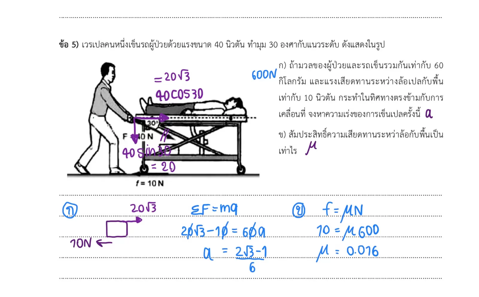 ข้อ 5) เวรเปลคนหนึ่งเข็นรถผู้ป่วยด้วยแรงขนาด 40 นิวตัน ทำมุม 30 องศากับแนวระดับ ดังแสดงในรูป