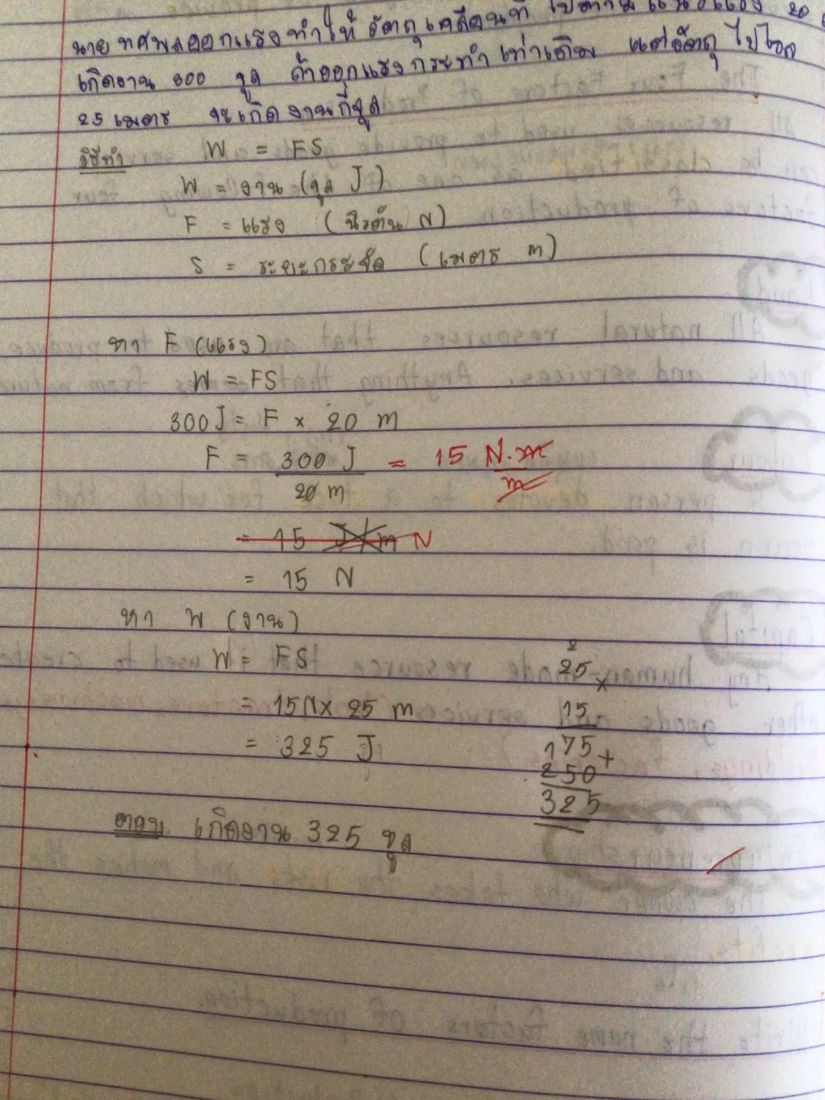 3. โจทย์บอกออกแรงเท่าเดิม ซึ่งเราหาแรงมาแล้วจากข้อ 2. คือ F = 15 N โจทย์ถามให้หางาน (W)