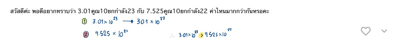 สวัสดีค่ะ พอดีอยากทราบว่า 3.01คูณ10ยกกำลัง23 กับ 7.525คูณ10ยกกำลัง22 ค่าไหนมากกว่ากันหรอคะ