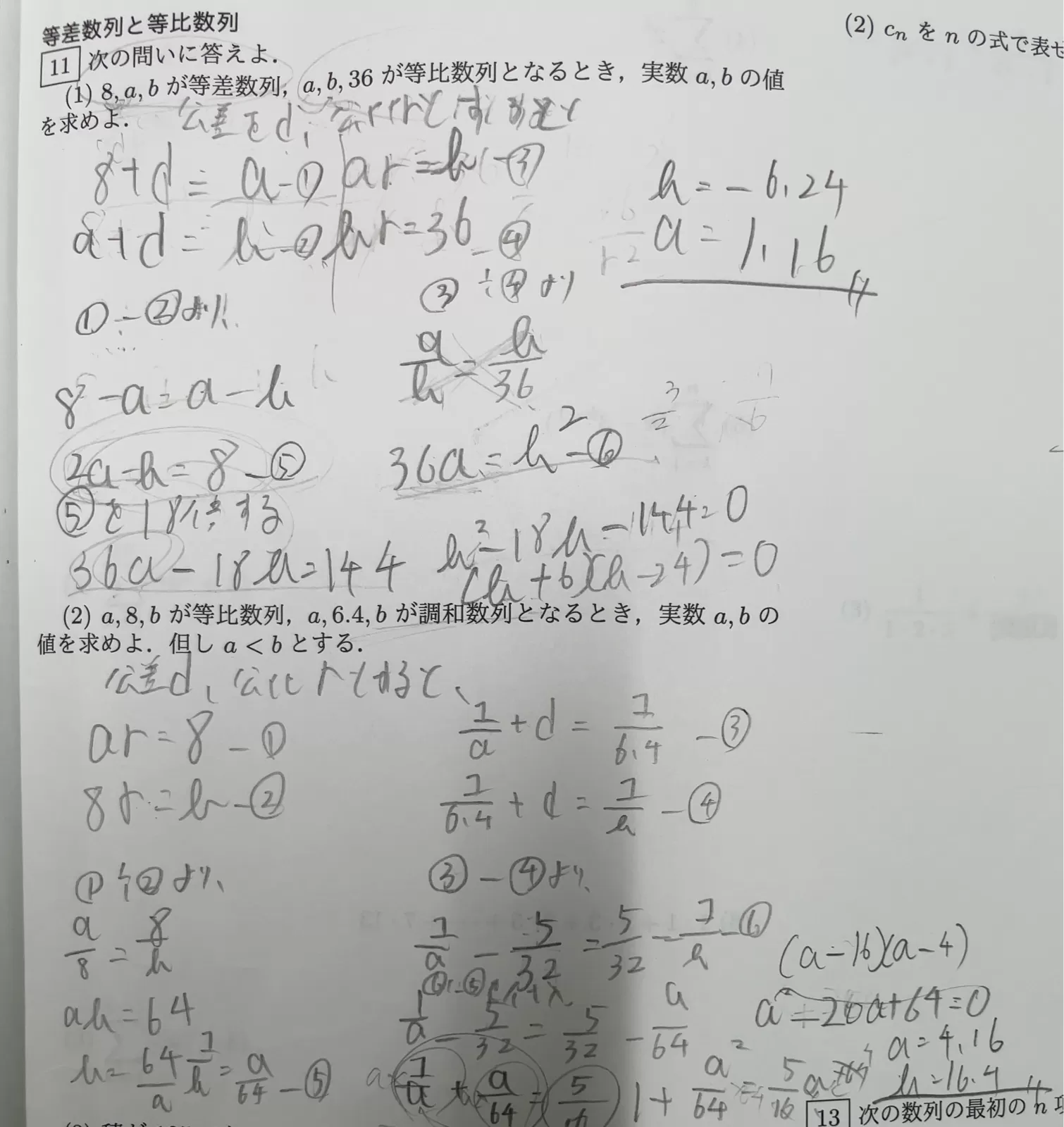 (1) 8, a,b が等差数列, a, b, 36 が等比数列となるとき, 実数a,b の値
