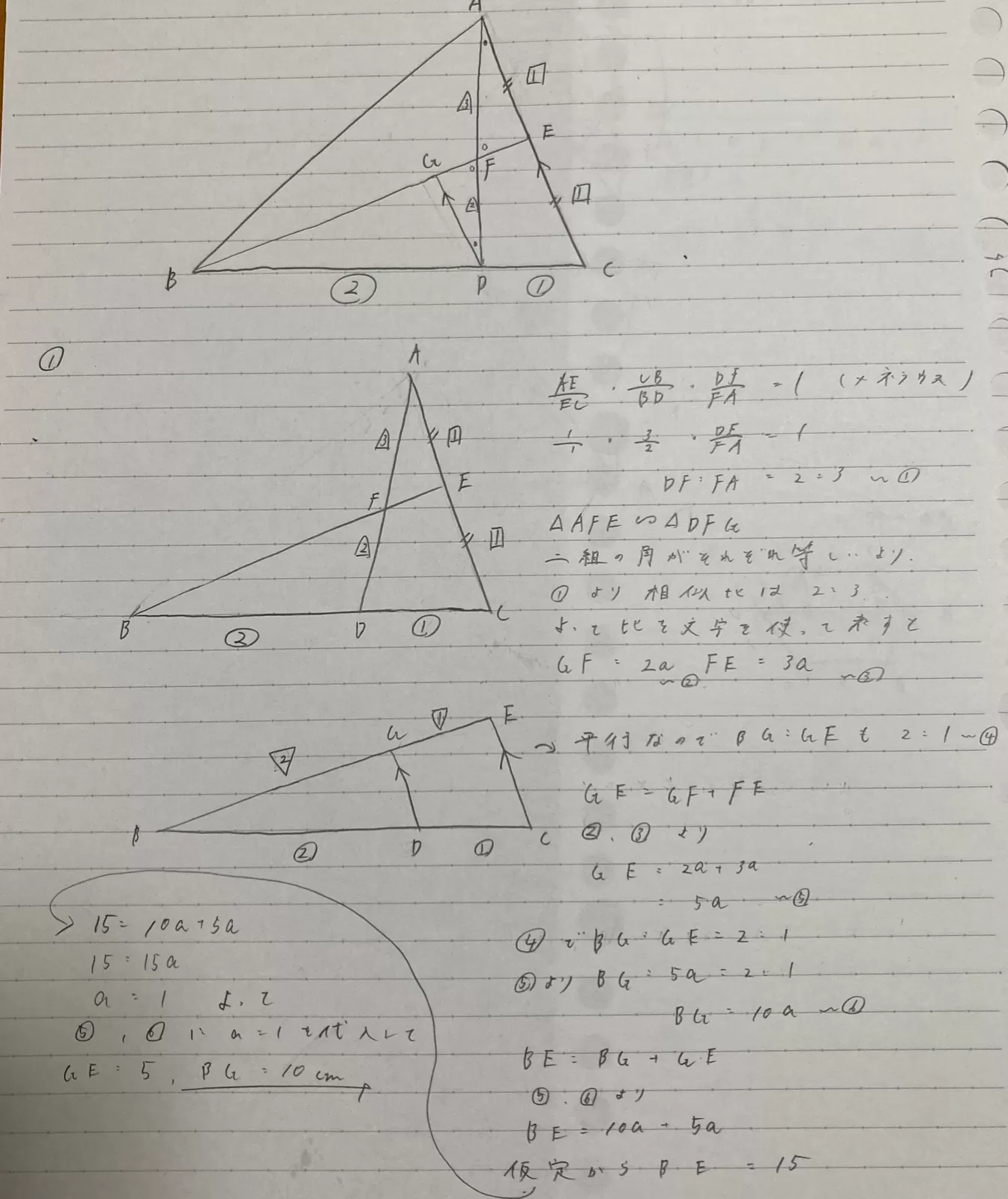 右の図でBD:DC =2:1、 AE = ECである。 また点Gは線分BE 上
