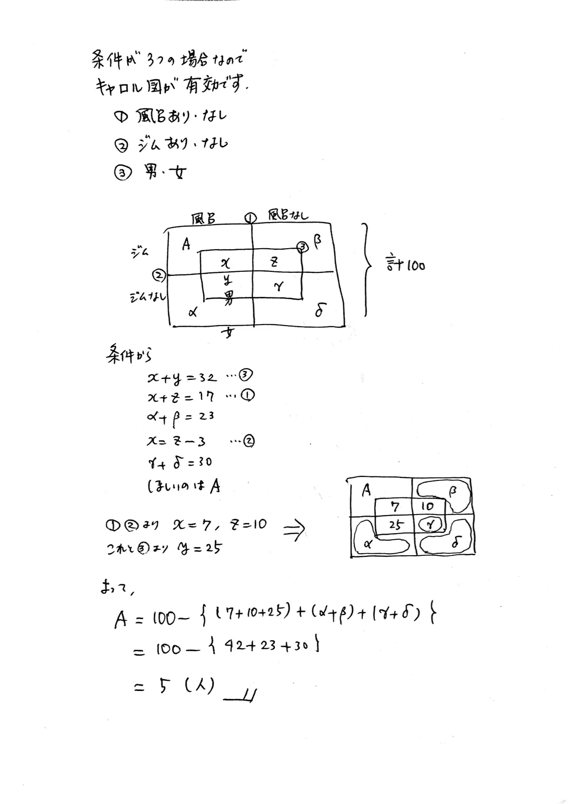 ・3番目の条件で、〝風呂を利用し、かつジムも利用した男性は、ジムだけ利用した男性より3人少ない〟というのがあったので、17-3で14にしました。
