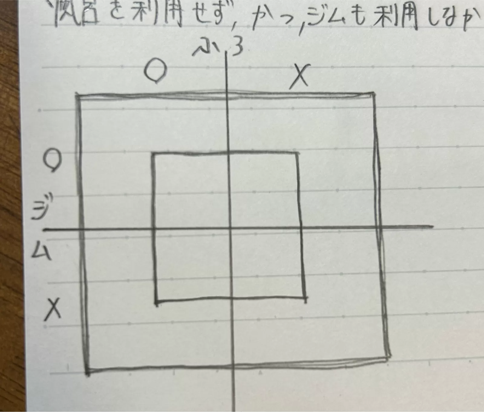 ①はじめに、風呂かつジムを利用しなかった女性の数をxとおいて式を立てようとしたんですけど、方向性がわからないのでやめました。