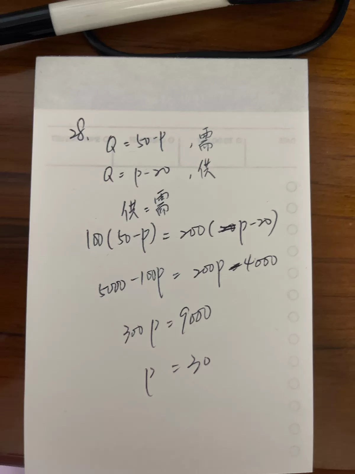 P=Q, 50-P = 20 + Q