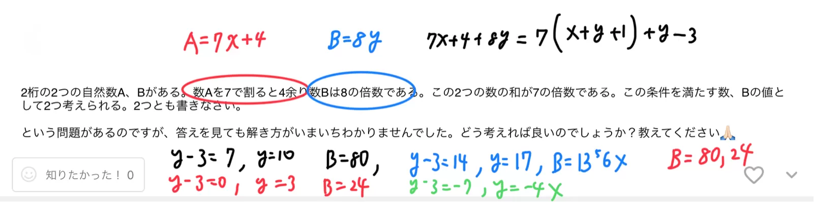 2桁の2つの自然数A、Bがある。数Aを7で割ると4余り数Bは8の倍数である。この2つの数の和が7の倍数である。この条件を満たす数、Bの値として2つ考えられる。2つとも書きなさい。