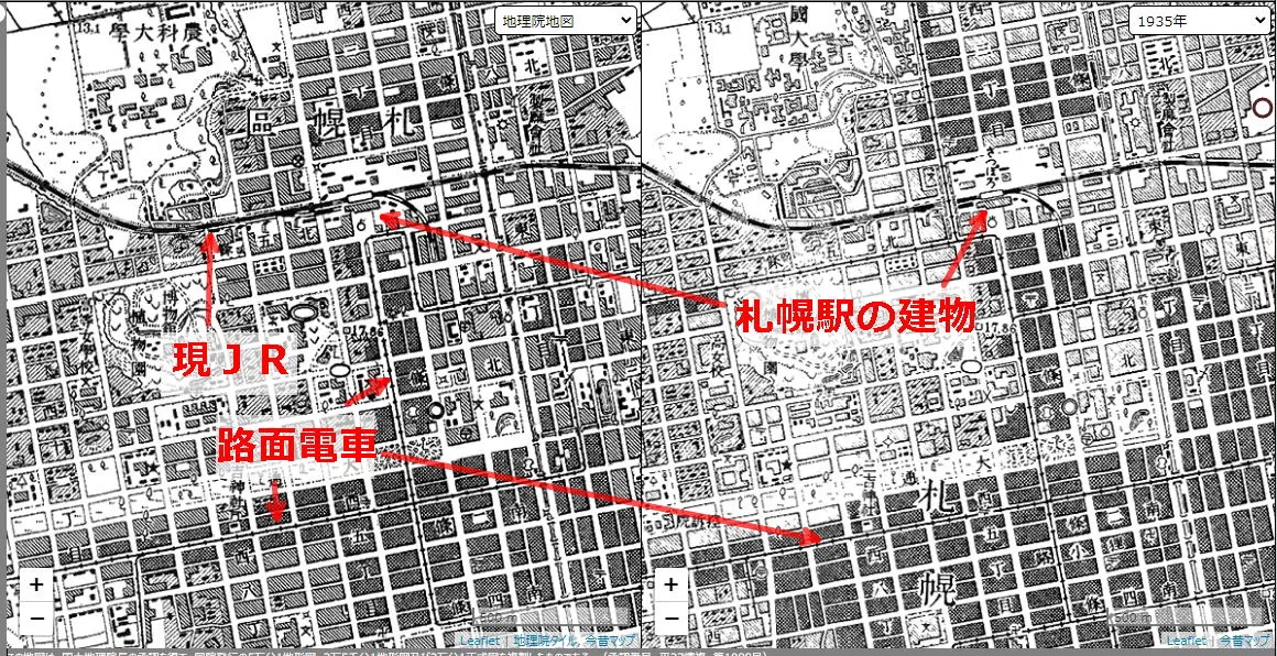 2つ目の質問なんですが、③と④の地図の比較で、さっぽろ とかかれた文字の所に着目して欲しいのですが、③は黒と白のJR単線?が記載されているのに対し、④にはそうではなく白線というかただの線というか、、、2つの時代で少し印象が違ってみえたのでなにか交通整備でもあったのかなって思いました。