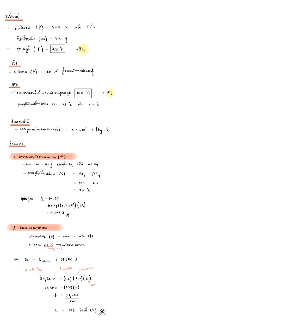 กาต้มน้ำอันหนึ่งให้พลังงานความร้อน 500 W เมื่อไปต้มน้ำ 100 g ที่อุณหภูมิ 25°C ถ้าน้ำรับพลังงานความร้อนได้ 20% ของพลังงานงานทั้งหมด จะใช้เวลานานเท่าใดในการต้มน้ำจนมีอุณหภูมิ 100°C (กำหนดให้ cน้ำ= 4.2×10³ J/kg)