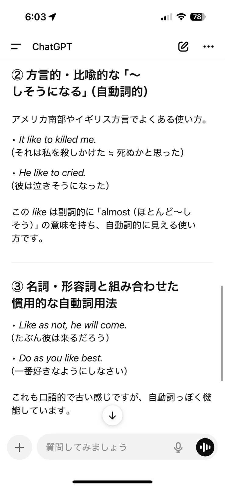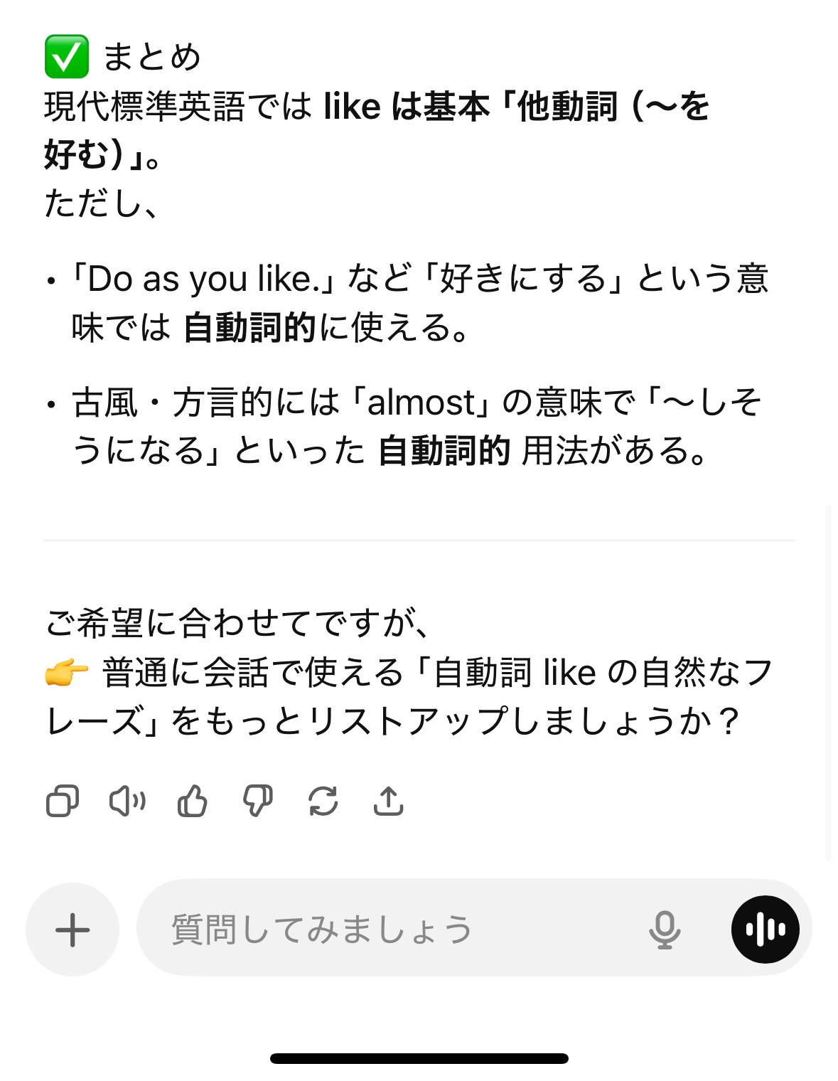 自動詞likeの説明はここまでで、ここから下は他動詞の用法を含めた一般的なlikeを使ったフレーズの紹介なので、それを明確にするためです。