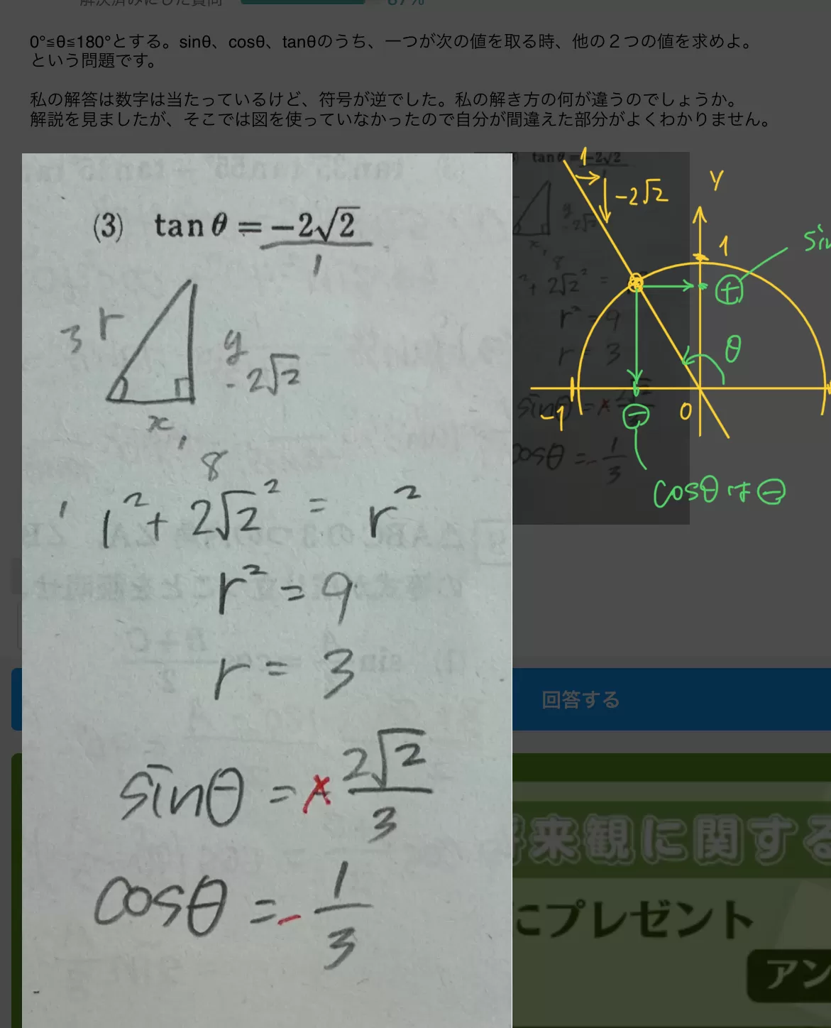 0°≦θ≦180°とする。sinθ、cosθ、tanθのうち、一つが次の値を取る時、他の2つの値を求めよ。