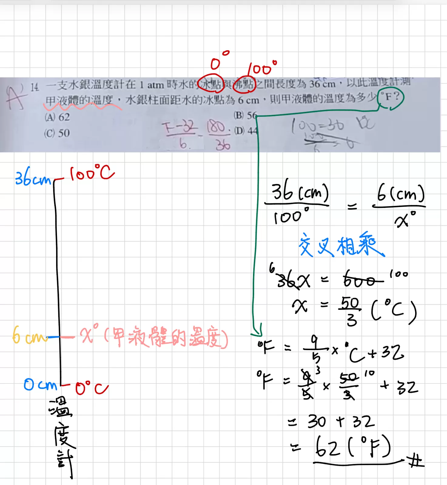 14.一支水銀溫度計在1atm時水的冰點與沸點之間長度為36cm,以此溫度計測