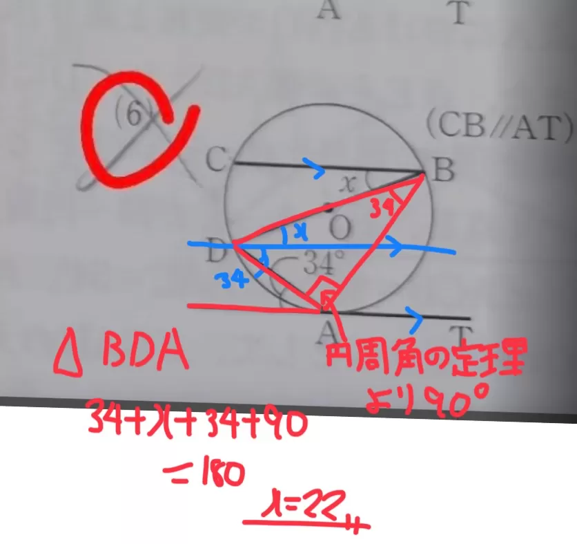 (6ZABD=34°, ZBAD=90°, ZADB=2x+34°, 34°+90°+(x+34°)=180°, x=22°