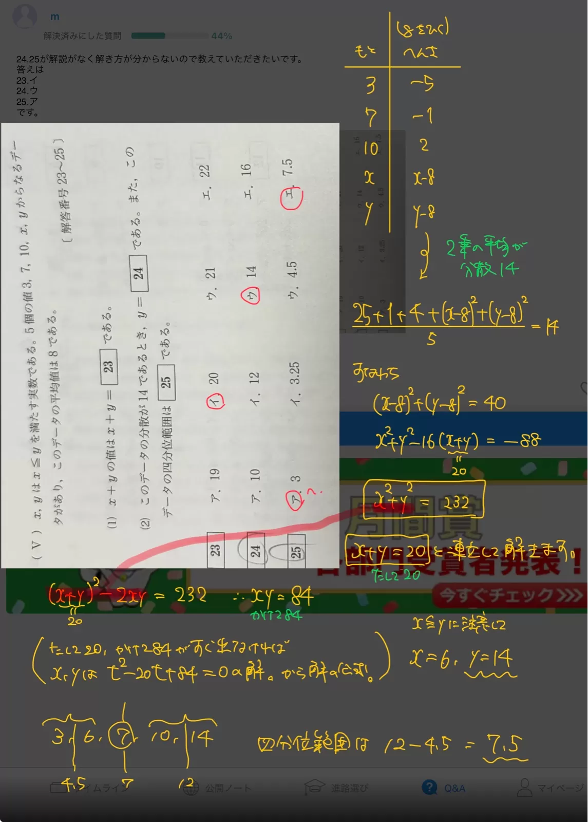 (V) x,yはxSyを満たす実数である。 5個の値 3, 7, 10, x,yからなるデー