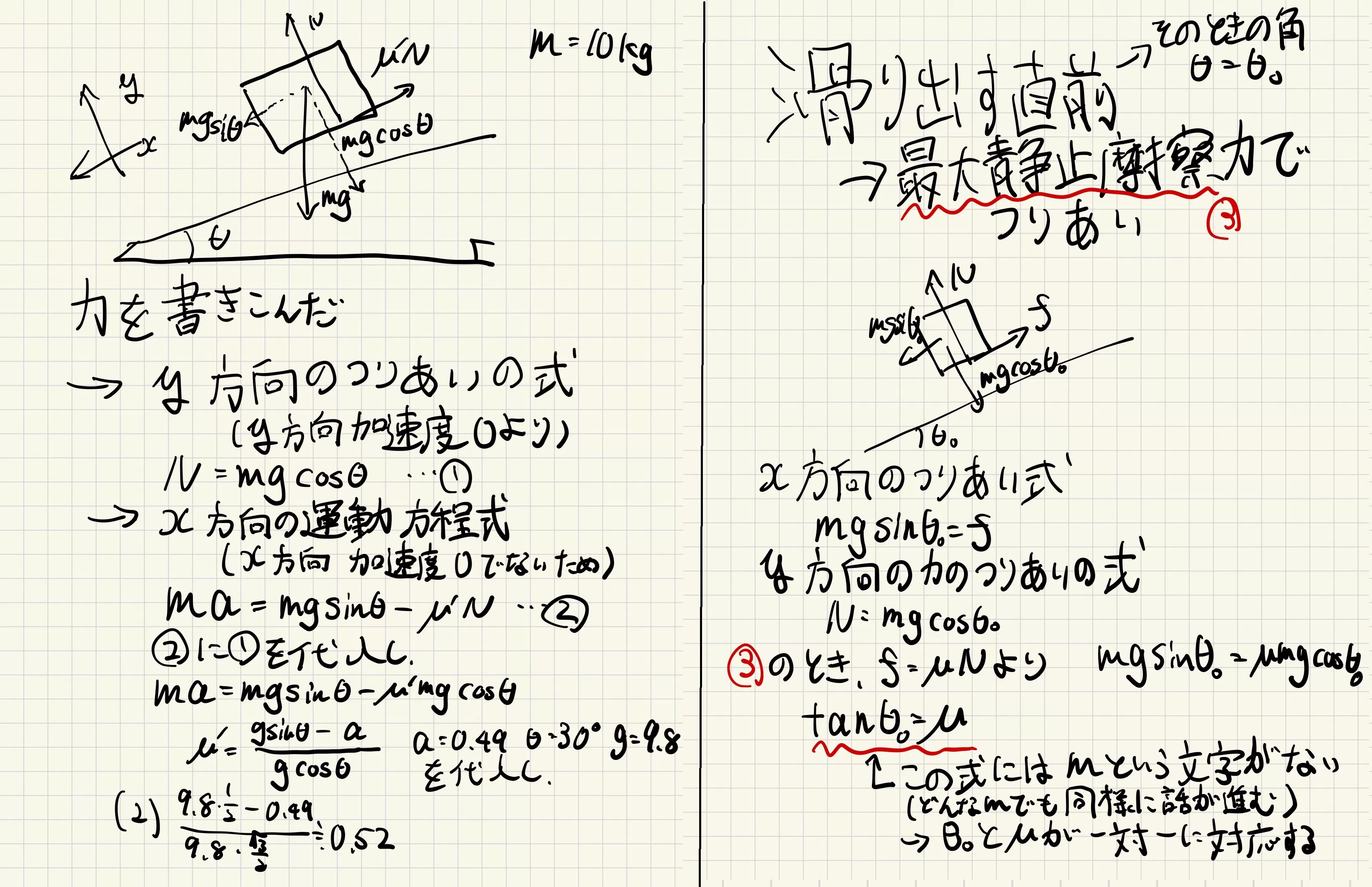 (2) 斜面に平行な方向の合力Fは,動摩擦係数を