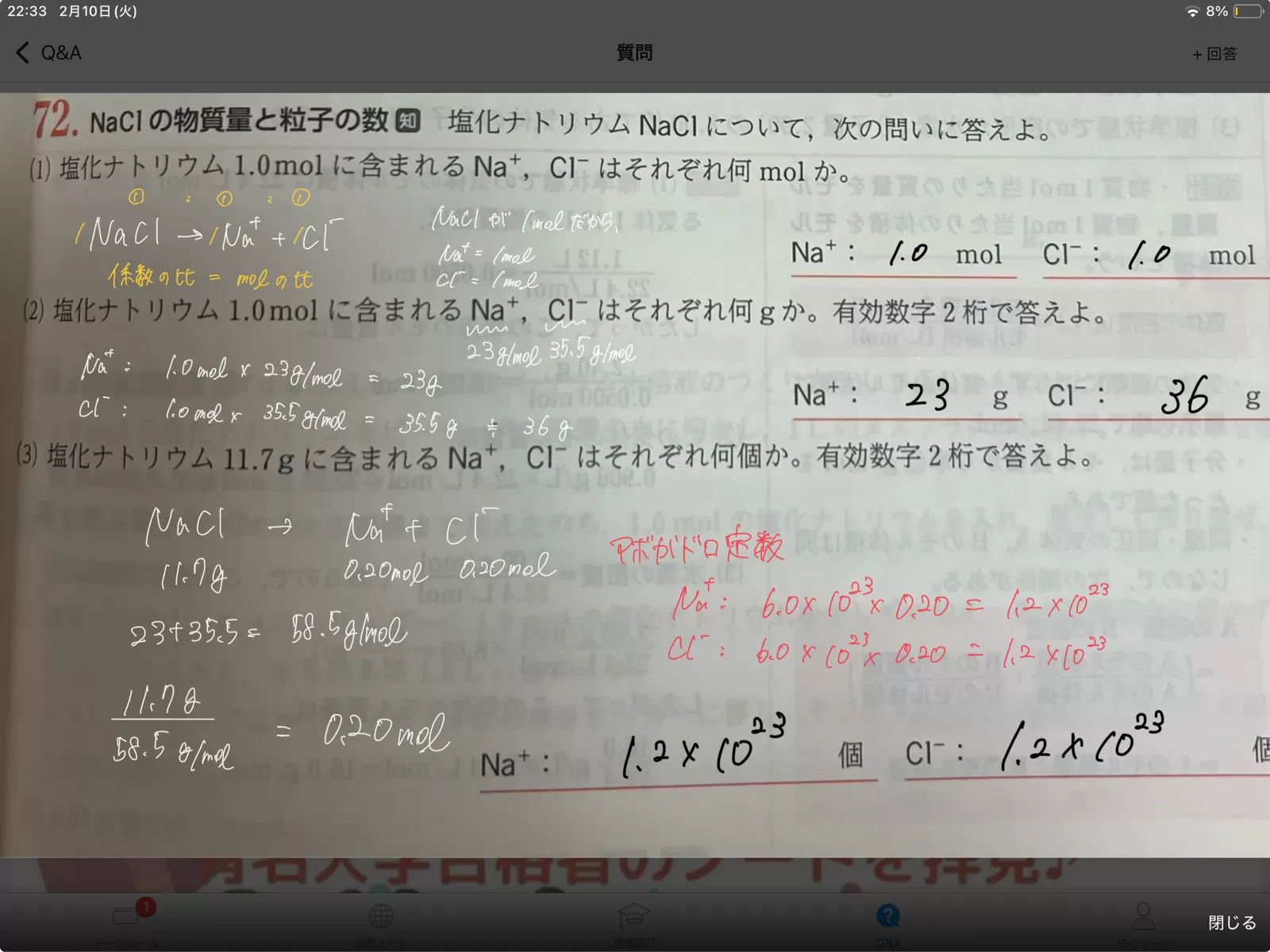 (3)塩化ナトリウム 11.7g に含まれる Na+, CI- はそれぞれ何個か。 有効数字2桁で答えよ。千