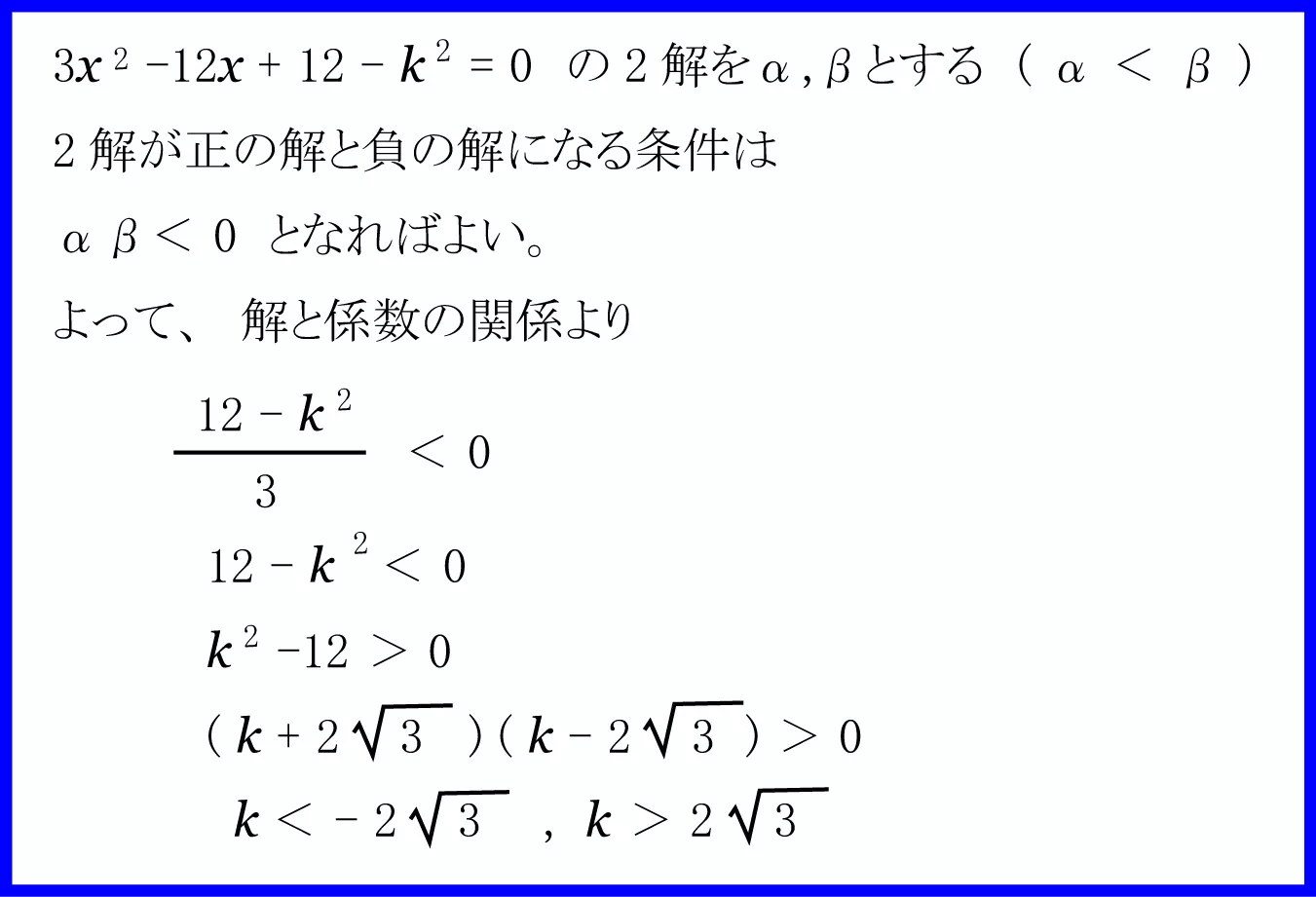 2次方程式 3x²-12x+12-k²=0 が正の解と負の解を1つずつもつことから