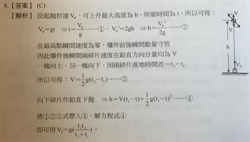 這題我也算了一下子,臨時也想不到什麼更快的方法,我的做法是先算出t1時的質心位置就可以知道上方塊的高度,就可以求上方塊的初速就可以算出答案,要注意的是整個過程動量都不守恆,因為質心受重力作用,所以我們不能用動量守恆去描述