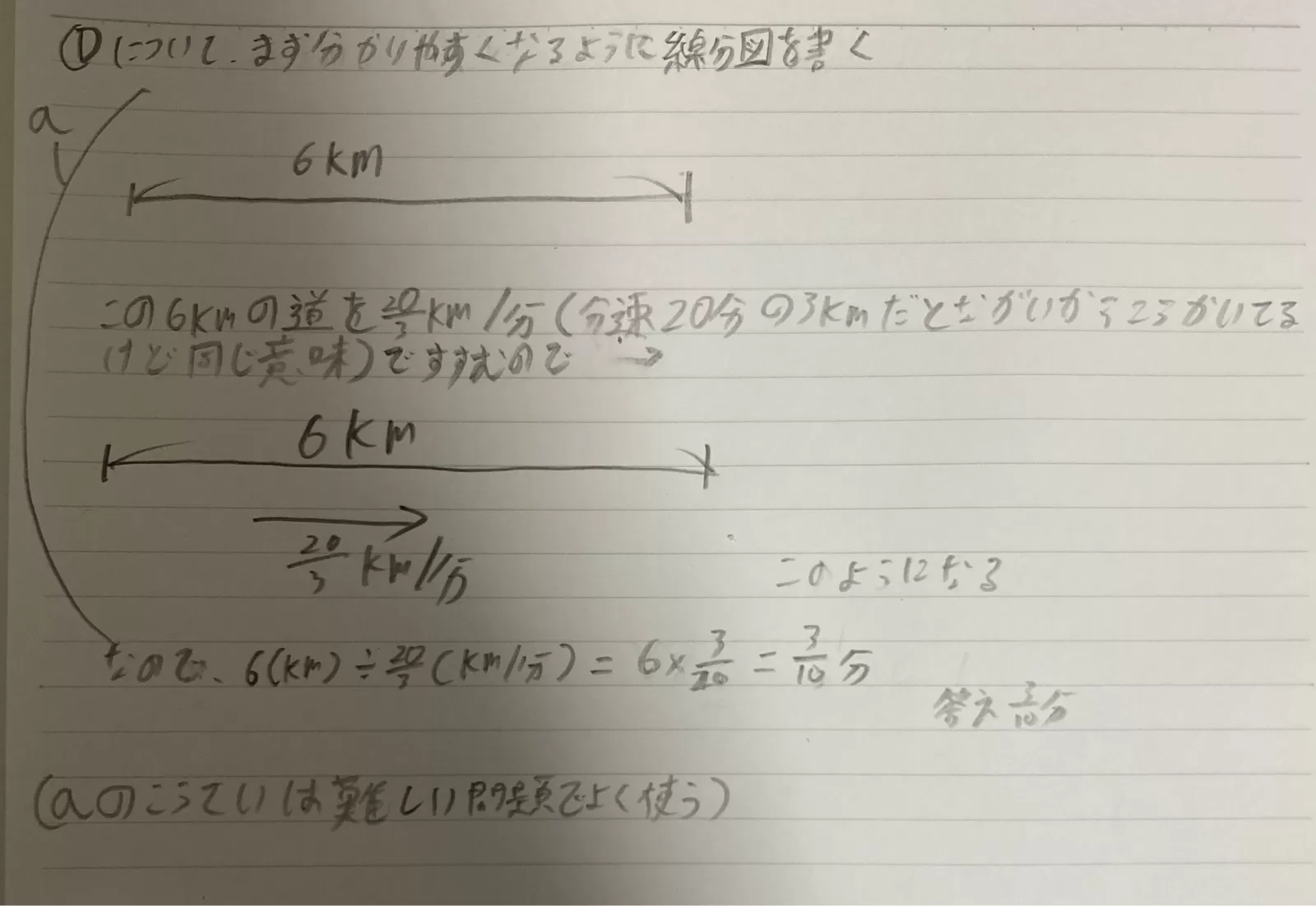 ①6kmのジョギングコースを、分速20分の3kmで走ると、何分かかりますか。