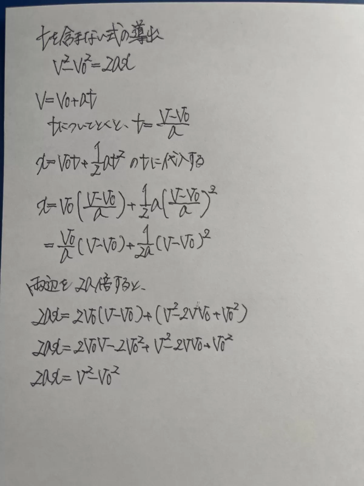 ・加速度を求めるには時間tの間での速度変化を知る必要がありますが、1番下の式は時間tを用いなくとも導出できる式です。