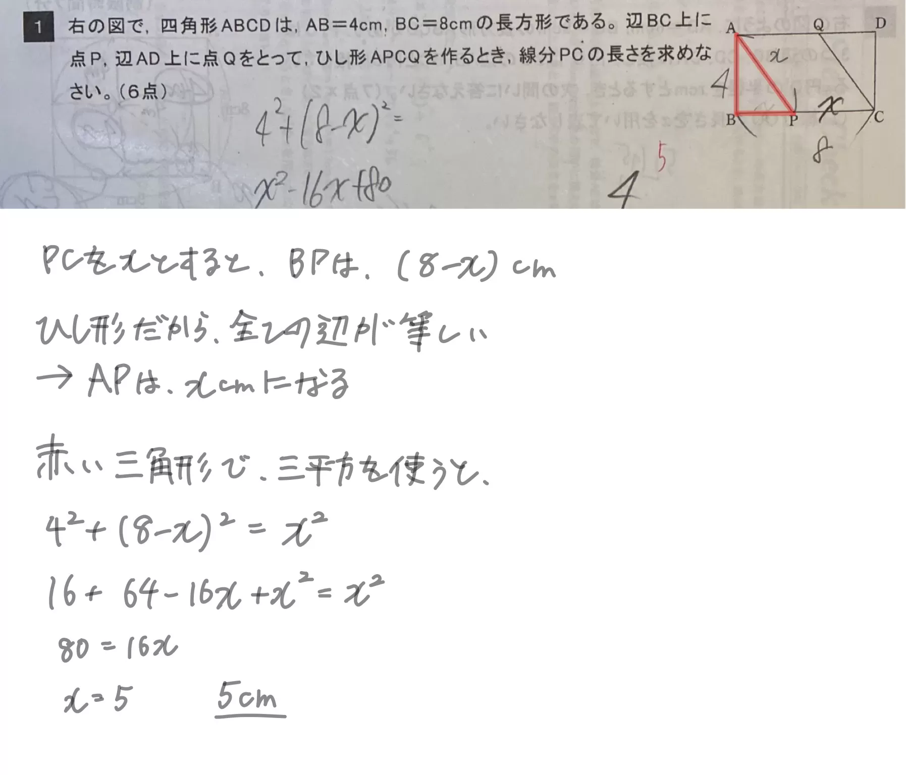 点P,辺AD上に点Qをとって ひし形 APCQを作るとき、 線分PCの長さを求めな