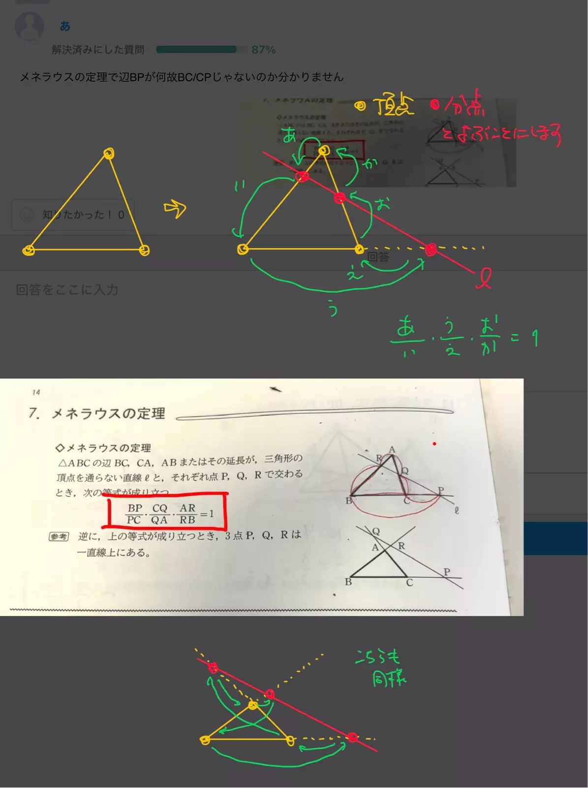 メネラウスの定理で辺BPが何故BC/CPじゃないのか分かりません