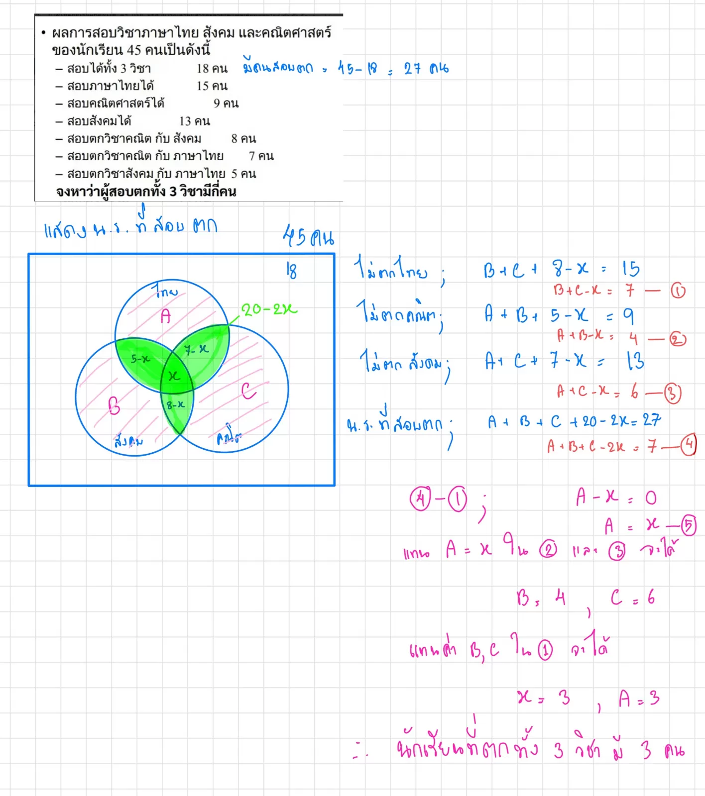 จงหาว่าผู้สอบตกทัง 3 วิชามีกี่คน